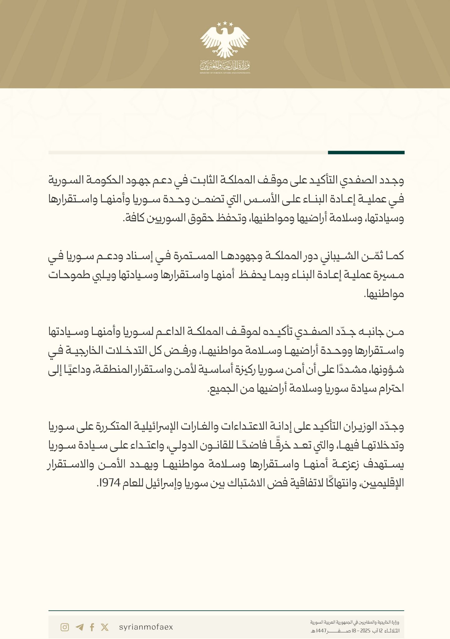 جدد كل من الوزير الصفدي والمبعوث باراك تأكيد دعم بلديهما الكامل لسوريا، ودعوا المجتمع الدولي للوقوف إلى جانبها في جهودها لإعادة البناء وتحقيق الاستقرار.