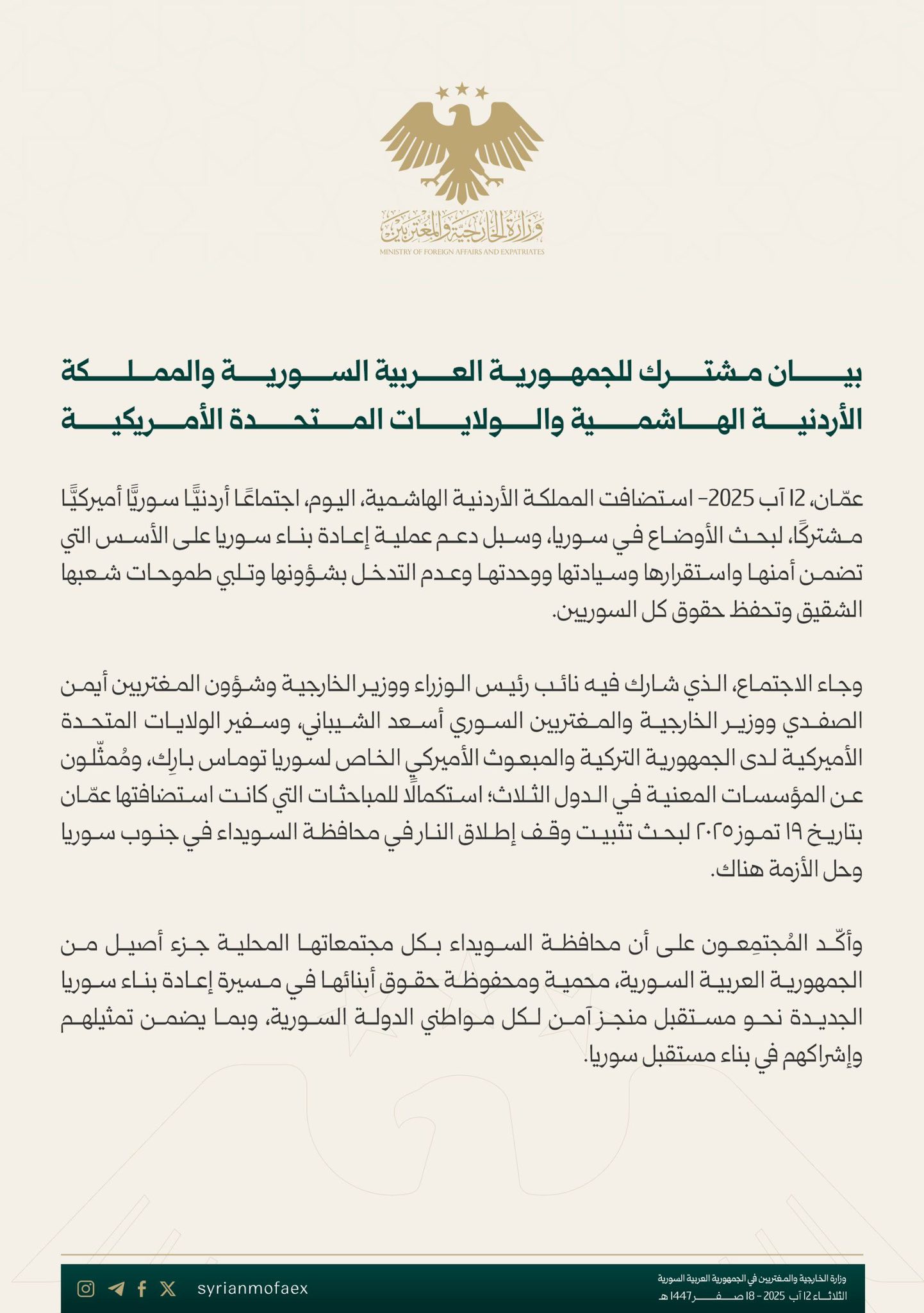 يأتي هذا اللقاء كاستكمال للمباحثات التي استضافتها عمان في 19 تموز/يوليو الماضي، والتي ركزت على تثبيت وقف إطلاق النار في محافظة السويداء وحل الأزمة فيها.