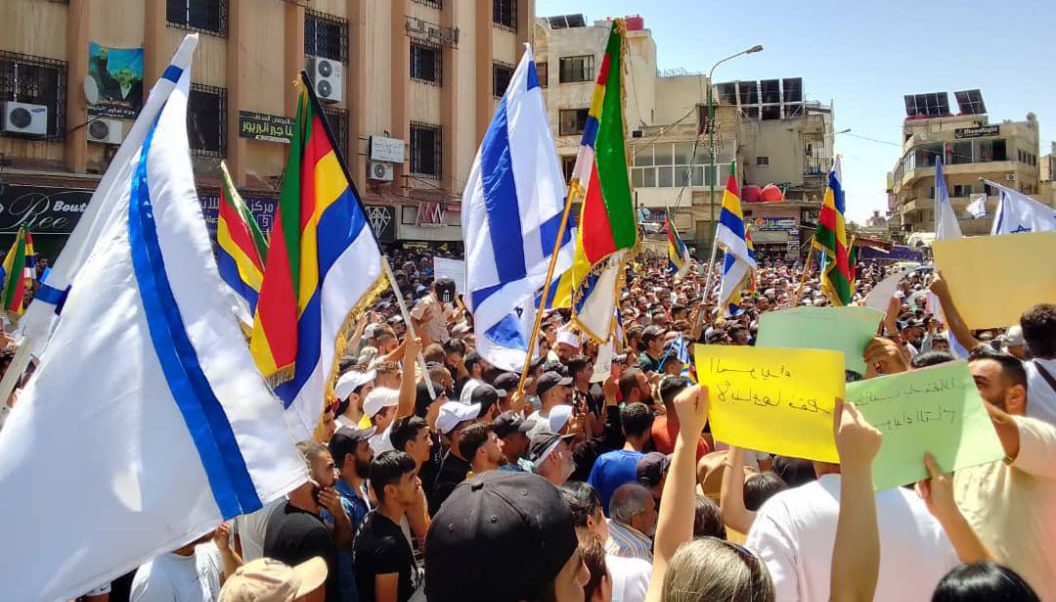 لكن في المقابل، شهدت ساحة وسط المدينة تجمعاً لمئات المتظاهرين فيما أسموه “حق تقرير المصير”. وفاجأ المتظاهرون المشهد برفعهم أعلام إسرائيل بشكل واضح، وهتفوا بعبارات تطالب بدخولها إلى السويداء.