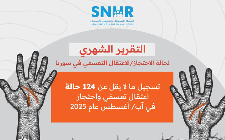 كشف تقرير شهري صادر عن الشبكة السورية لحقوق الإنسان عن تسجيل ما لا يقل عن 124 حالة اعتقال تعسفي واحتجاز في سوريا خلال شهر أغسطس/آب 2025. ويأتي هذا التقرير في سياق المرحلة الانتقالية التي تمر بها سوريا بعد سقوط نظام الأسد في 8 ديسمبر/كانون الأول 2024 وتولي حكومة انتقالية زمام السلطة.
