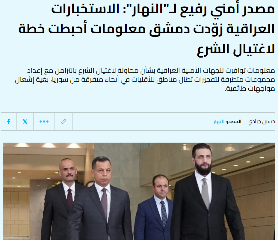 في تقرير مثير للجدل، زعمت صحيفة “النهار” اللبنانية، يوم الجمعة، أن السلطات السورية أحبطت مؤامرة لاغتيال الرئيس السوري ، أحمد الشرع، بفضل معلومات استخباراتية قدمها العراق قبل ستة أشهر.