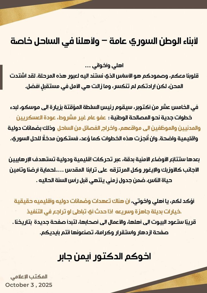 أثار بيان منسوب إلى رجل الأعمال والممول العسكري لنظام الاسد أيمن جابر – أحد أبرز المقربين من عائلة الأسد وأحد ممولي ميليشيات النظام – موجة من الجدل بين السوريين، بعد أن دعا فيه إلى ما وصفه بـ“مرحلة مصالحة وطنية شاملة” تتضمن العفو العام وعودة العسكريين والمدنيين إلى مواقعهم و“خروج الفصائل من الساحل بضمانات دولية”.