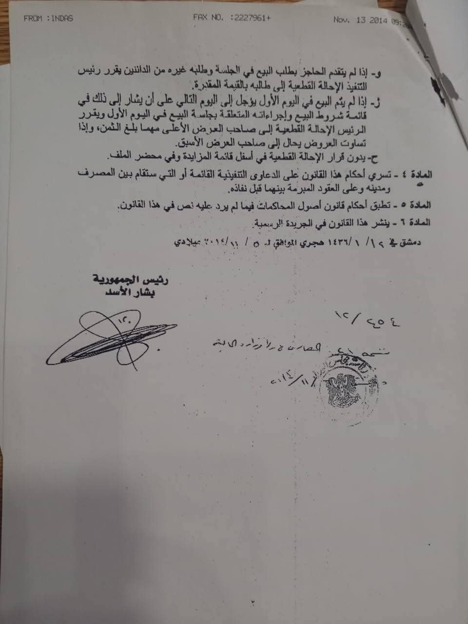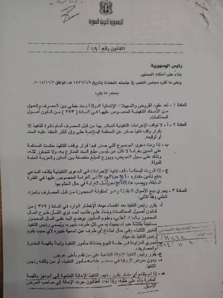 ورغم ذلك، استمرت المصارف في تطبيق القانون القديم، في تجاهل صريح للقانون الأحدث، وبتواطؤ واضح من السلطات القضائية والأمنية آنذاك. وتؤكد مصادر قضائية أن مدير تنفيذ في محافظة حلب تم عزله فوراً بقرار أمني بعد أن رفض تطبيق هذا القانون الجائر.