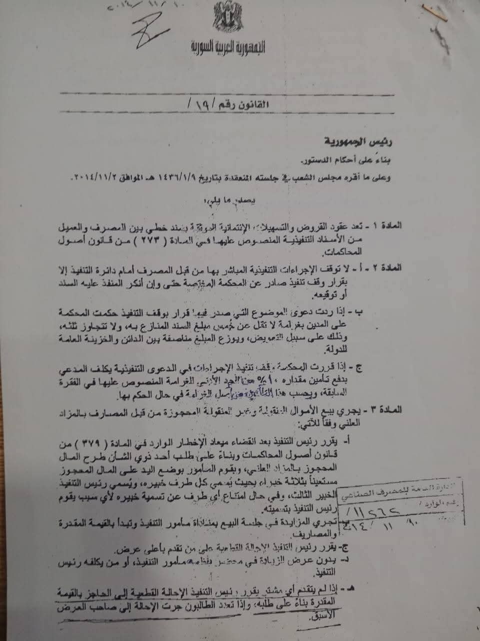 عادت قضية “قانون النهب رقم 19” الصادر عام 2014 لتطفو على السطح مجدداً، كاشفةً عن مأساة آلاف السوريين الذين فقدوا منازلهم في مزادات علنية، بعد أن استغلته المصارف الحكومية كأداة منظمة للاستيلاء على ممتلكات المعارضين والمهجرين تحت غطاء قانوني.