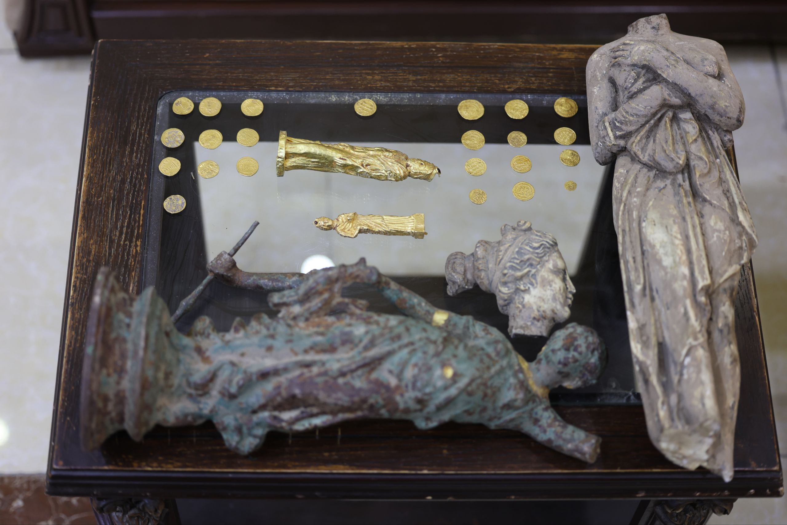 وجاءت العملية بعد ورود بلاغات من مواطنين، حيث تم توقيف عدة مجموعات مستقلة وضبط بحوزتهم قطع نقدية ذهبية أثرية، وتماثيل معدنية وحجرية.