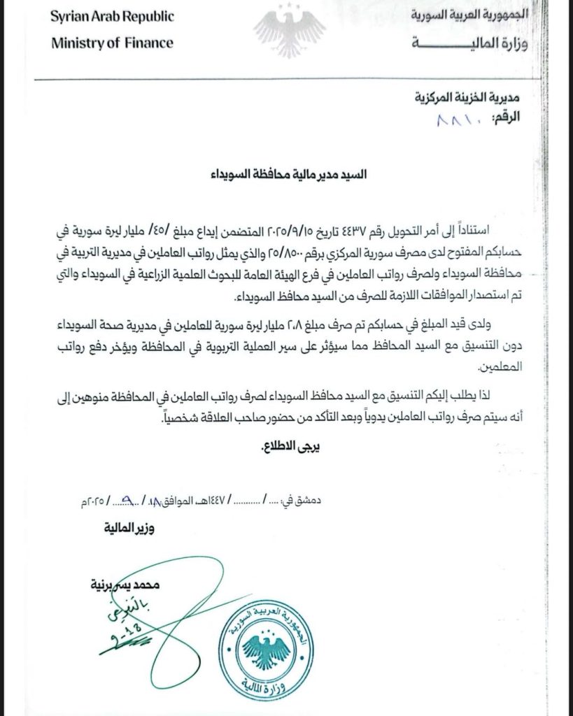 في تطور خطير يهدد مستقبل محافظة السويداء، كشفت وثيقة رسمية صادرة من وزارة المالية تؤكد تحويل مبلغ يقارب المليون دولار أمريكي من وزارة المالية بدمشق لصالح رواتب العاملين في قطاعات التربية والصحة والبحوث الزراعية بالمحافظة.