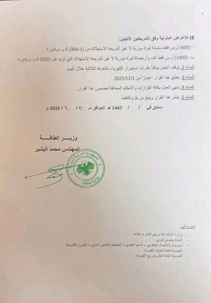 تشهد سوريا ارتفاعاً غير مسبوق في تكلفة استهلاك الكهرباء بعد صدور التعرفة الجديدة التي حددت سعر الكيلو واط الساعي بـ ٦٠٠ ليرة لأول ٣٠٠ واط، و١٤٠٠ ليرة لما بعدها.