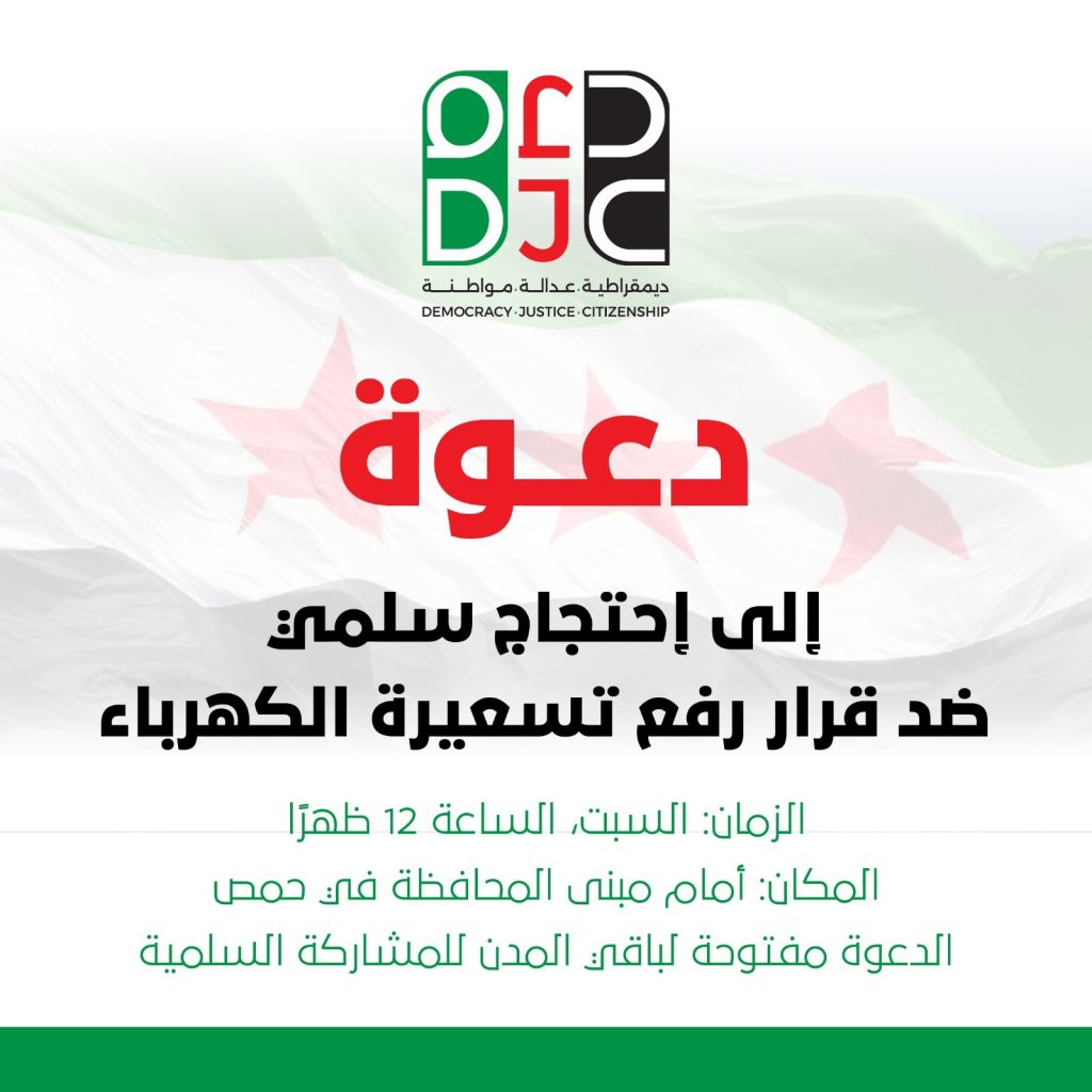 تحت شعار “لا لرفع أسعار الكهرباء – الكهرباء حق للناس”، ينظم تجمع دعم (ديمقراطية – عدالة – مدنية) غدًا السبت 8 تشرين الثاني 2025، وقفة احتجاجية في مدينة حمص، وذلك من الساعة 12 ظهرًا حتى 1 ظهرًا، على درج مؤسسة الهاتف مقابل الساعة الجديدة ومبنى محافظة حمص
