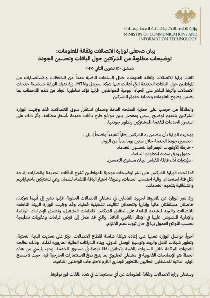 والأدهى أن الحكومة تواصل تبرير سوء الخدمة واحتكار الشركتين المشغلتين، بل وتمضي أبعد من ذلك بتقديم الشكر لهما على “الجهود”، في حين أن السوريين يعيشون أسوأ مستويات الإنترنت والاتصال في المنطقة.