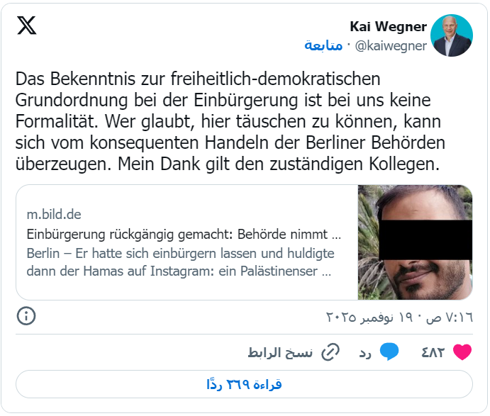 مصادر أمنية أكدت لوكالة الأنباء الألمانية أن مكتب الهجرة قرر إلغاء تجنيس الشاب وسحب جواز سفره، بعد نشره صورة على إنستغرام لمقاتلين من “حماس” مع عبارة “أبطال فلسطين”.