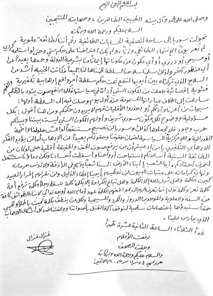 غزال غزال، الذي جدّد ظهوره بدعوة أنصاره إلى اعتصام للمطالبة بإطلاق سراح موقوفين، توجّه في خطابه إلى “المكوّن السني”، مؤكداً أنه “ليست بيننا وبينكم حرب وجود فلا تجعلوها كذلك”، ومشدداً على أن سوريا “لن تصبح مستنقعاً لداعش”. وطرح في بيانه حلولاً سياسية تقوم على “الفدرالية واللامركزية السياسية”، باعتبارها طريقاً لضمان حقوق الجميع والابتعاد عن التطرف.