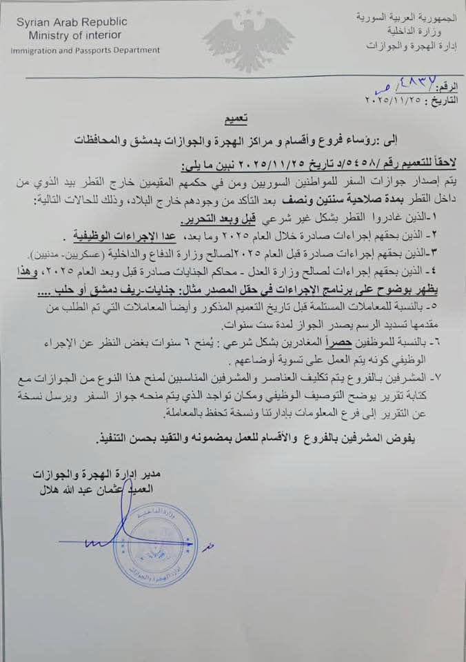 أعلنت إدارة الهجرة والجوازات السورية عن تعميم جديد يحدد الإجراءات المحدثة لمنح جوازات السفر للمواطنين السوريين المقيمين خارج البلاد، في خطوة تهدف إلى تسوية أوضاع شرائح واسعة تعذر عليها تجديد وثائقها خلال السنوات الماضية. ويأتي هذا التعميم امتداداً لقرار سابق صدر بتاريخ 25 تشرين الثاني 2025 تحت الرقم ٨٥٤٥/ د/٤٥٨.