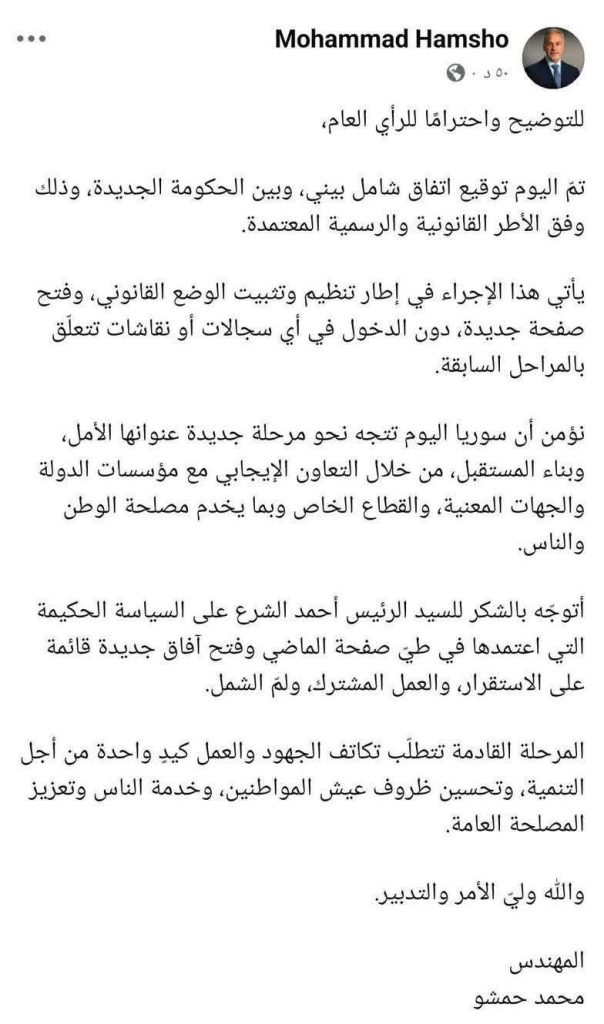 إن هذا الاتفاق المزعوم، الذي يهدف إلى “تنظيم وتثبيت الوضع القانوني” لحمشو دون “الدخول في أي سجلات أو نقاشات تتعلق بالمراحل السابقة”، هو محاولة مكشوفة لـ غسل جرائم الماضي، وإعادة تقديم مجرم للسوريين بصفة “شريك في البناء”.