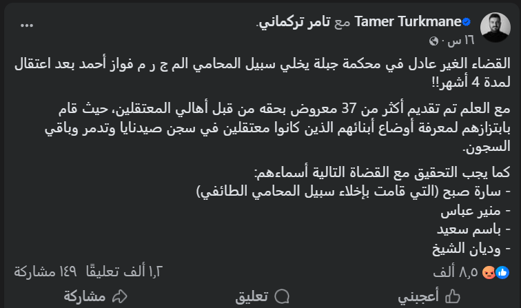 أثار منشور متداول لتامر تركماني موجة تفاعل واسعة في الأوساط السورية، عقب الحديث عن ما وُصف بـ”القضاء غير العادل” على خلفية الإفراج عن المحامي فواز أحمد بعد أربعة أشهر من الاعتقال.