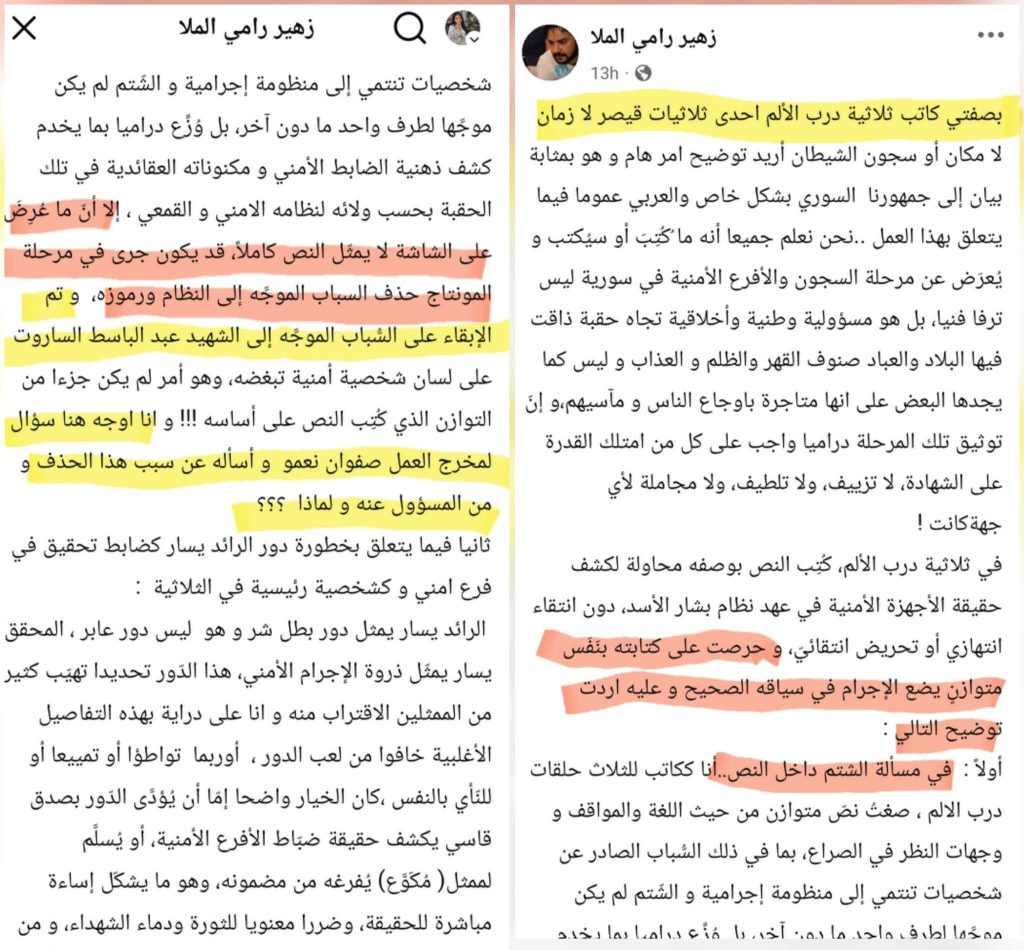 وفي منشور له، وجه الملا تساؤلات حادة إلى مخرج العمل، صفوان نعمو، وإلى نقيب الفنانين، مازن الناطور، مطالباً إياهم بتوضيح أسباب هذا التعديل الذي يراه تحريفاً للنص الأصلي. وأكد الملا أن النص كُتب بأسلوب متوازن يعكس وجهات النظر المختلفة في الصراع، وأن الشتائم كانت موجهة لشخصيات تنتمي إلى “منظومة إجرامية”، وموزعة درامياً لخدمة كشف “ذهنية الضابط الأمني” .