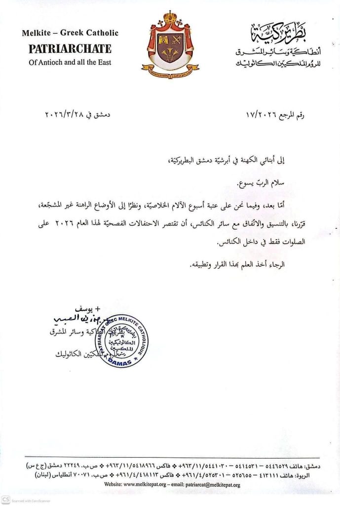 وجاء في البيان الصادر بتاريخ 28 آذار 2026 أن القرار اتُخذ على خلفية الأوضاع الراهنة غير المستقرة، وبعد تنسيق مع سائر الكنائس، مع توجيه دعوة للكهنة في أبرشية دمشق البطريركية للالتزام الكامل بهذه التوجيهات وتنفيذها.