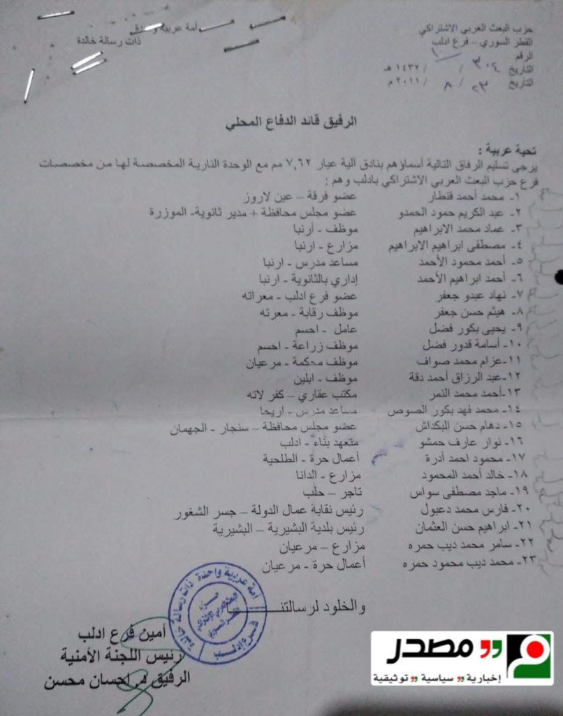 كشفت وثيقة مسرّبة تعود إلى أغسطس/آب 2011 عن تورط مباشر لفرع إدلب في حزب البعث العربي الاشتراكي في تسليح مدنيين وموظفين حكوميين للعمل كميليشيات ومخبرين لصالح النظام السوري السابق في المحافظة. وتُظهر الوثيقة، الصادرة عن أمين فرع الحزب ورئيس اللجنة الأمنية في إدلب آنذاك، إحسان محسن، توجيهات صريحة بتسليم بنادق آلية من عيار 7.62 ملم مع ذخيرتها لثلاثة وعشرين شخصاً من أعضاء الحزب وموظفين في مناطق مختلفة من ريف إدلب، وذلك ضمن مخصصات أمنية لمواجهة الحراك الشعبي في بداياته.
